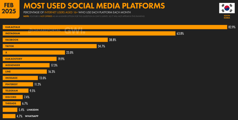 So, where are South Korean social media users spending their time? As you can see in the graph below, KakaoTalk is the most popular social platform in South Korea, followed by Instagram. Both these platforms are used by more than half of all South Korean internet users every month.