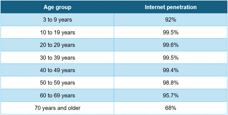 The table below shows internet penetration by age group in South Korea. As you can see, there are very high levels of internet penetration across the entire 3 to 69 age group (over 92%), with this then dropping off over the age of 70: