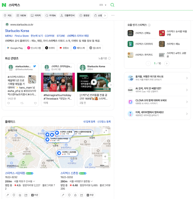 Let’s look at some screenshots to see what Naver looks like. The first image below shows the Naver homepage, before the user has made a search. The second screenshot shows the search engine results page for the search query “Starbucks” (in Korean). As you can see, Naver looks totally different from Google, with Naver being much “busier” with content.